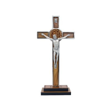 合金圣本笃十字架带圣牌橄榄木带底座-21x10cm