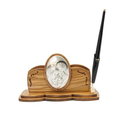 银浮雕橄榄木摆件笔筒-圣母抱耶稣-8.8×8.8x11cm