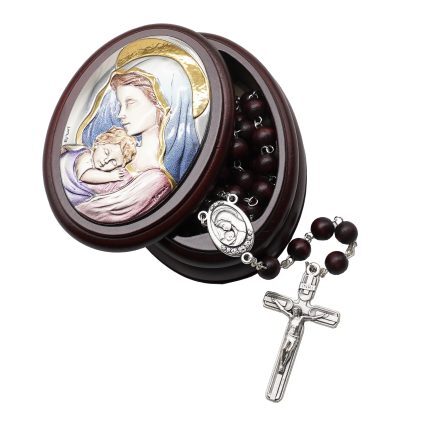 玫瑰念珠-桃木套装-圣母抱子-彩色-925银浮雕像-带盒
