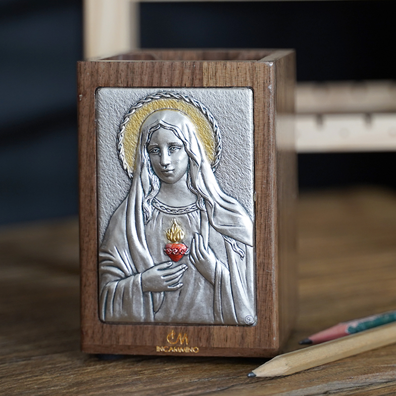 笔筒-浮雕圣像-圣母圣心-胡桃木特制纪念款-11×7.5×7.5cm